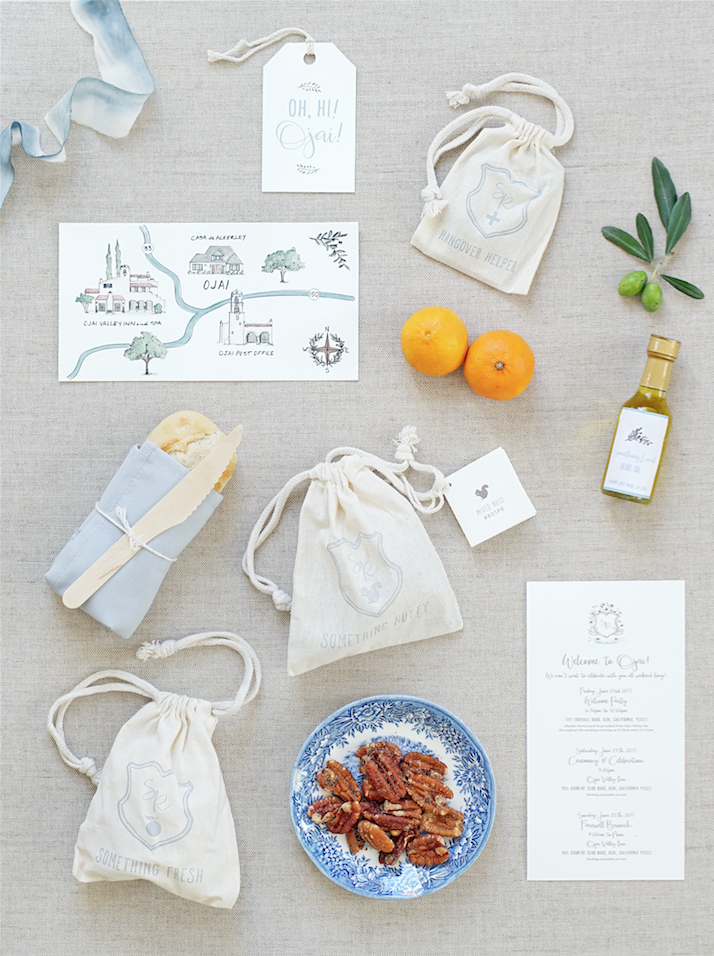 For welcome gifts, we try to focus on local snacks and the items one needs to survive the Ojai sun. Consider all things citrus like all the ingredients for a Pixie Margarita or even just some fresh fruit. Granola from …. Or cookies from …. . Local olive oil and a mini baguette is also sure to be devoured and gives guests a peek into the local flavor. And if you want to really give your guests something useful, a hat, sunscreen or other protective elements is a good idea.