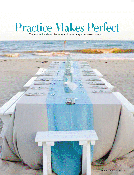 We’re excited to see Michelle & Austin’s clam bake in the current issue of Inside Weddings. As a way to welcome guests to the Hamptons, the couple hosted a traditional beach celebration complete with a lobster boil, mussels, local brews and so much more. We played off of the natural landscape of the area with neutral linens and runners & other details in shades of blue from ocean to sky. On the tables, we lined them with galvanized lanterns and buckets of beautifully presented necessities from moist towelettes to lemons making the decor not only approachable but functional. The guests dined under the stars, grooved to a live acoustic guitarist and in the end, lounged by the bonfire on floor pillows and throws while roasted marshmallows. It was a blast and we can’t wait to make our way back to the East Coast soon!