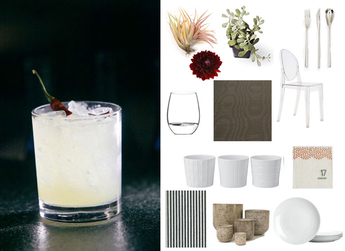 Spicy Margarita with Tequila & Hot Pepper Infused Lime Juice from Pharmacie LA / Airplants, deep red dahlias & gray succulents / Dragonfly flatware / Stemless Glassware / Pewter Moire Linen / Ghost Chairs / White Ceramic Pots / Custom lucite stationery from Beth Helmstetter Events / Black & White Essex Napkins / Stone Pots / White Coupe China