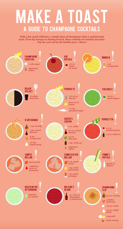 My idea of celebrating has always included lots of champagne! I’m a traditionalist that way, I guess. But, while overall I do like to keep it classic with the bubbly, I love to get a little creative with the presentation and flavors. For instance, when we are Hawaii bound, nothing’s better than a Mango Mimosa or maybe a simple glass of sparkling with floating candied hisbiscus. If we are going Old Hollywood, I love a French 75 in a coupe glass. Or, if I’m feeling playful, we love the idea of putting a frosty popsicle inside to take the stuffiness out of this sophisticated cocktail. No matter what, I think there is a version of a champagne cocktail for just about everyone. To prove it, we dug up this charming little chart that can serve as a cheat sheet for your next champagne worthy celebration. If you’ve tried any (or all!!) of these cocktails, definitely let me know your favorite! Cheers!