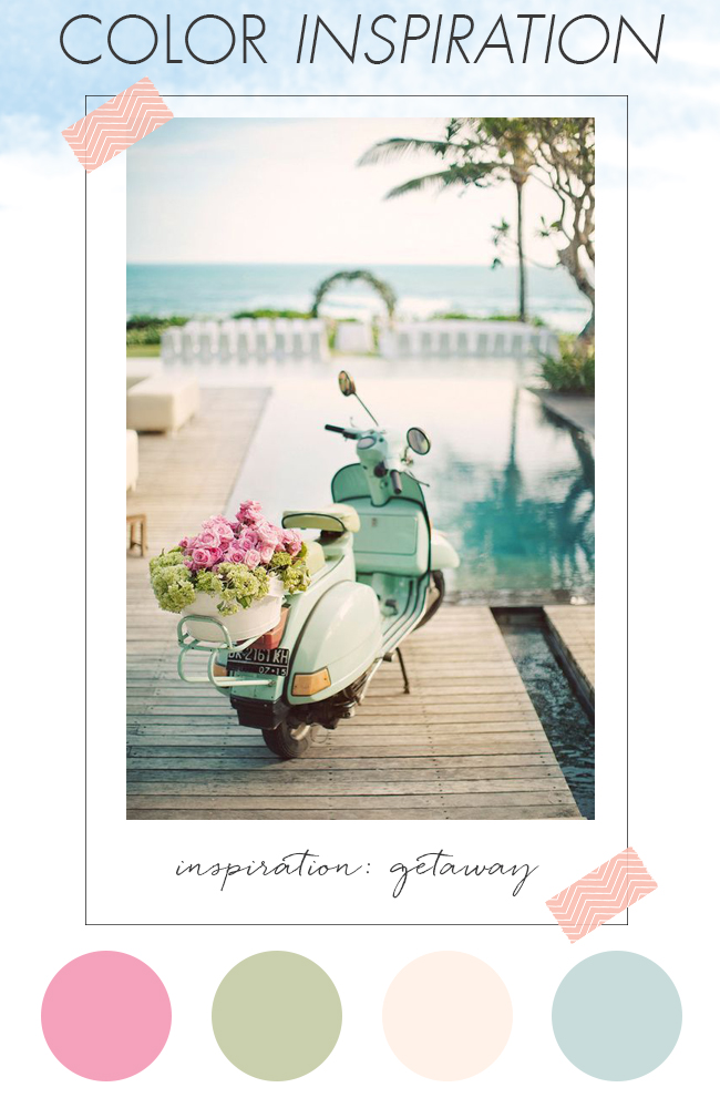 I saw this image and I was instantly transported away from my studio and laptop, and into a romantic getaway. I love the fresh, feminine colors that brings about a feeling of just…. pretty, for a lack of better words. And this image – by the water? Check. Little mint colored scooter? Check. Scooter adorned with flowers? Check. All that’s missing is me, my love, and a glass of wine.
