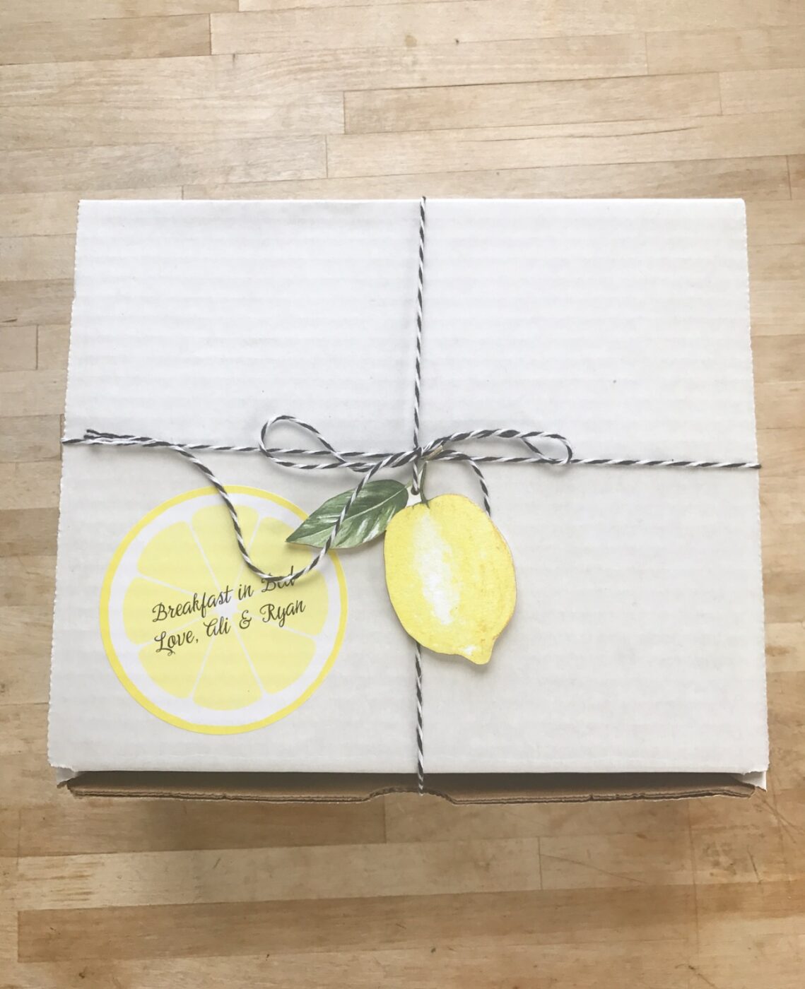 We choose to finish the outside of the box with a bit of baker’s twine, a custom sticker and a laser cut lemon that we had left over from the wedding invitations, but a simple piece of twine with an herb does the trick too. It doesn’t need to be overthought.