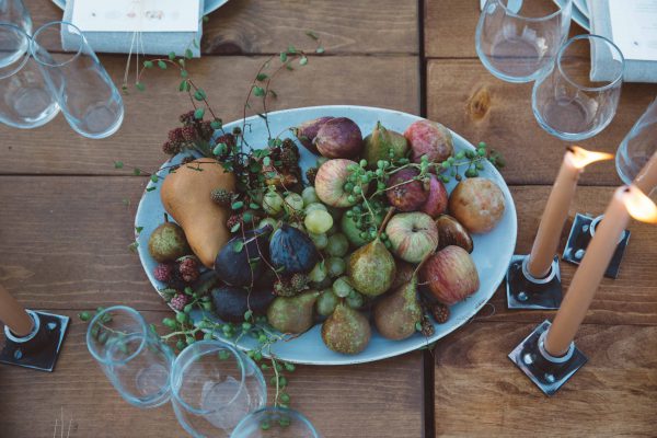 When creating seasonally inspired dinners or celebrations, fruit brings a sense of time and place to the table design. Pumpkins, pears and persimmons always feel distinctly autumn and even a bit nostalgic. For that reason I love incorporating them in my Thanksgiving tables capes or a wedding that’s happening in late October through beginning of December. Peaches remind me of summer, Italy and fresh pie. For that reason, I opt for this fruit when creating in August or September. And strawberries will forever remind me of late spring/early summer. They’re beautiful to use in Memorial Day tablescapes or other backyard dinners.