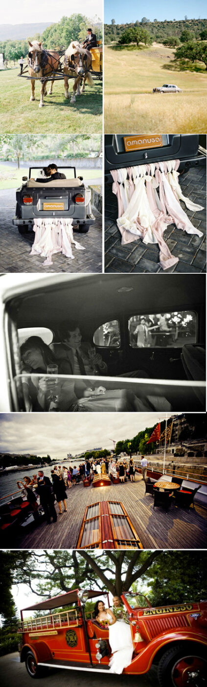 TOP ROW: Guest arrival by Clydesdale at Trapp Family Lodge in Stowe, Vermont from Steve Steinhardt /Vintage Rolls Royce at Liz & Chris’s Figueroa Farmhouse Wedding by Aaron Delesie