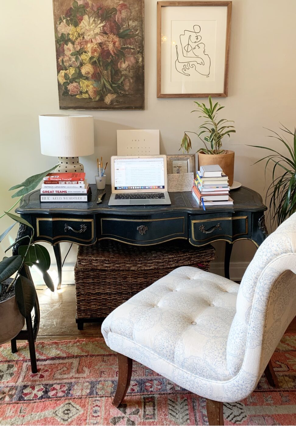 My computer, planner and then a handful of books I’m currently reading and referencing. I also try to keep my desk inspiring and well styled so have a few intentional details such as a