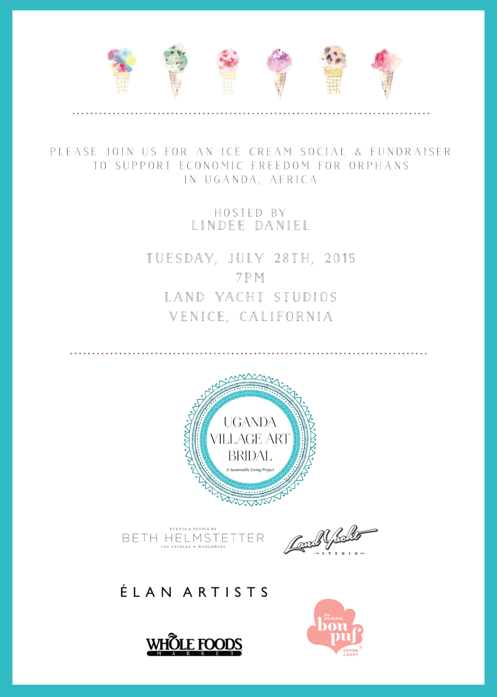 We’re honored to be supporting designer, Lindee Daniel, by sponsoring a fundraiser next Tuesday, July 27th, at Land Yacht Studio in Venice. Specifically this event will support Lindee in the creation of Uganda Village Art Bridal, which will be operated by the local village where 100% of the profits will be used to support local orphanages and health clinics through Bringing Hope To The Family. We would love to see each of you there! Click here for tickets and bring everyone you know! If you’re not in California but still want to get involved, you can donate here or even just read more about this amazing initiative.