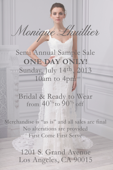 I don’t know about you ladies, but I love me some Monique Lhuillier. Her styles are just so romantic, amazingly detailed and approachable all at once. And, if you are like me AND you live in Los Angeles, than December 6th will be your lucky day. Monique Lhuillier is having a sample sale just in time for all of you holiday engagees out there. Whoot! Whoot! Here are the details: