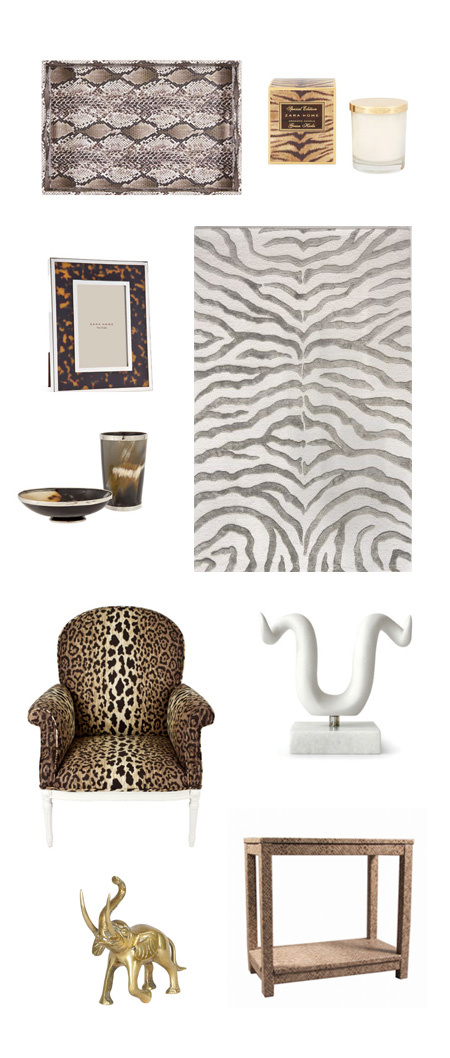 1.) SNAKESKIN TRAY 2.)CANDLE 3.)FAUX TORTOISE FRAME 4.)ZEBRA RUG 5.)HORN BATHROOM SET 6.)LEOPARD CHAIR 7.)HORN STATUE 8.)FAUX SNAKESKIN TABLE 9.) BRASS ELEPHANT