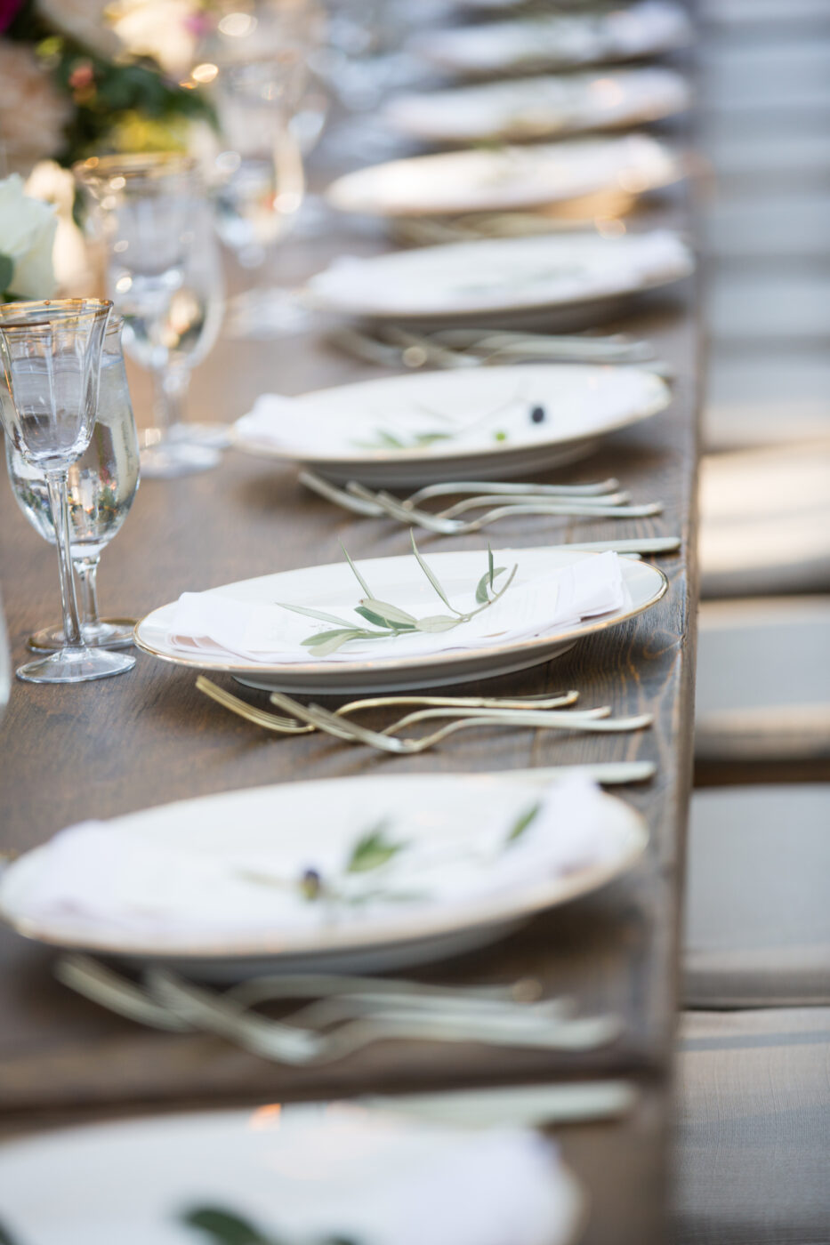 For charger plates and silverware, I personally like the the bottom of each to be lined up to the edge of the table, but whatever you personally prefer, make sure each place setting is consistent with the next. This level of organization offers a nice polish to the tablescape.