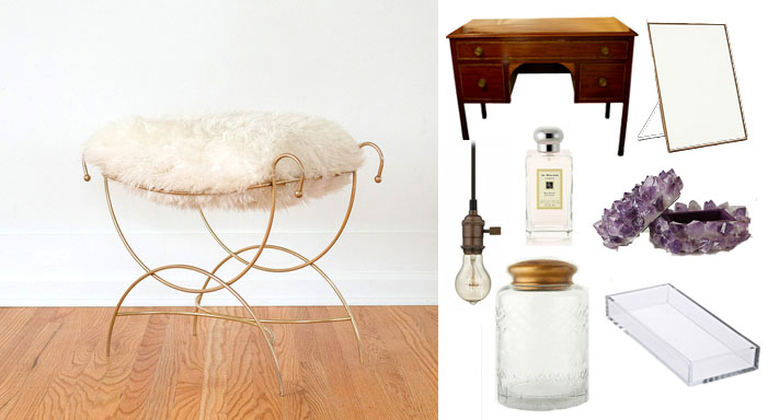 Faux sheepskin vanity stool / Vintage desk like these / Copper easel mirror / Edison bulb pendant / My favorite scent / A pretty box for my trinkets / A jar for the necessities / Lucite trays to hold the goods