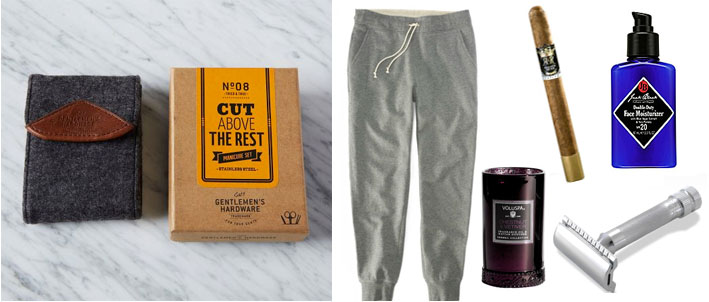 West Elm Gentlemen’s Manicure Kit / Leisure pants from Lululemon / Augusto Reyes Nativo Lancero Cigar / Men’s moisturizer from Jack Black / VOLUSPA candles in manly scents / Safety Razor from The Art of Shaving