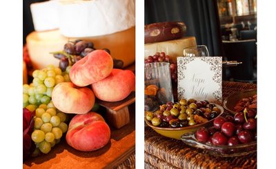 Cocktail hour included a wine tasting along with cheese pairing from three regions here in California including Napa Valley, Sonoma Valley and Central Coast. Guests mingled while listening to the tunes of Flamenco guitars and tasting over 12 different regional wines hand selected by a personal sommelier. For decor, we used wine barrels in lieu of traditional cocktail tables, old rustic doors for table tops and brightly colored flowers and fresh fruit to accent.